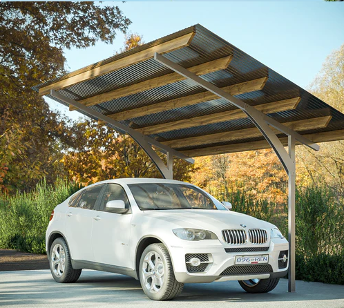 Garázs hiányában egy fából készült kocsibeálló praktikus megoldása,